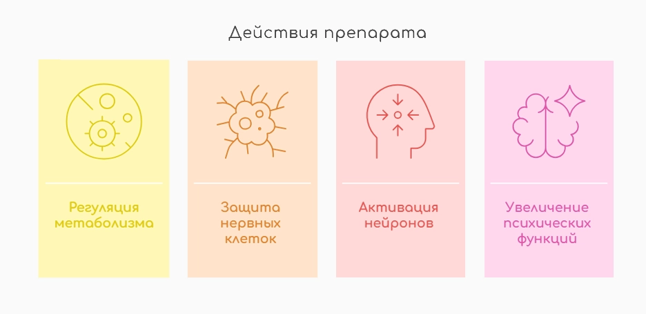 1. Препарат имеет 4 равноценных действия: метаболическая регуляция, защита нервных клеток, нейрон-специфическая активность, повышение когнитивных или других психических функций.